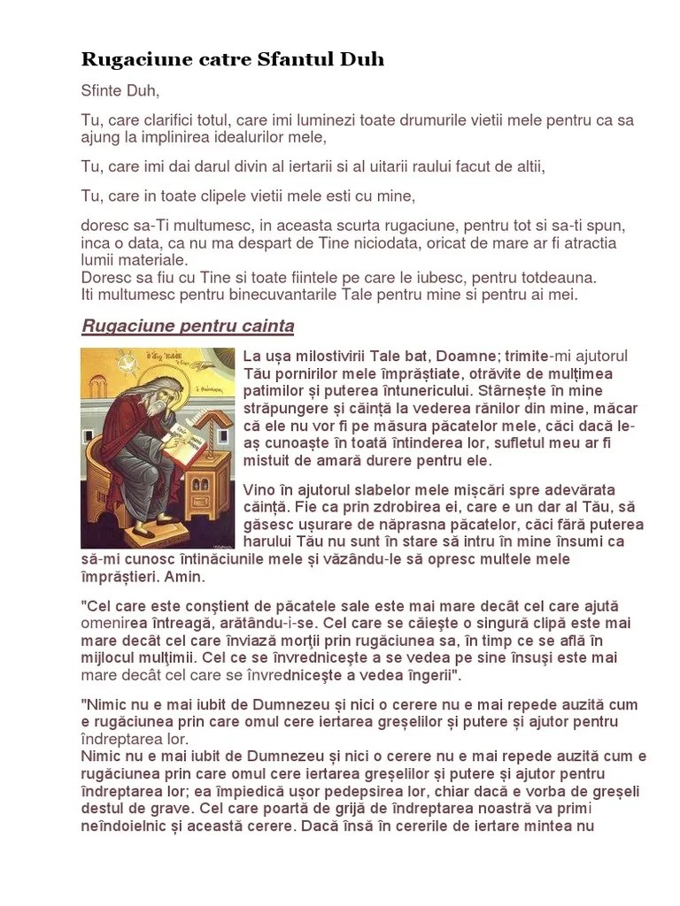 Rugăciunea se citește, de fiecare dată, de câte 3 ori. Această rugăciune către sfântul duh se revarsă asupra credinciosului aflat la nevoie. Împărate ceresc, preabunule mângâietorule, duhule al adevărului, cel ce din tatăl mai înainte de veci purcezi şi întru fiul pururea te odihneşti; 22.09.2021 · rugăciune către sfântul duh.. Se face timp de 9 duminici consecutiv.